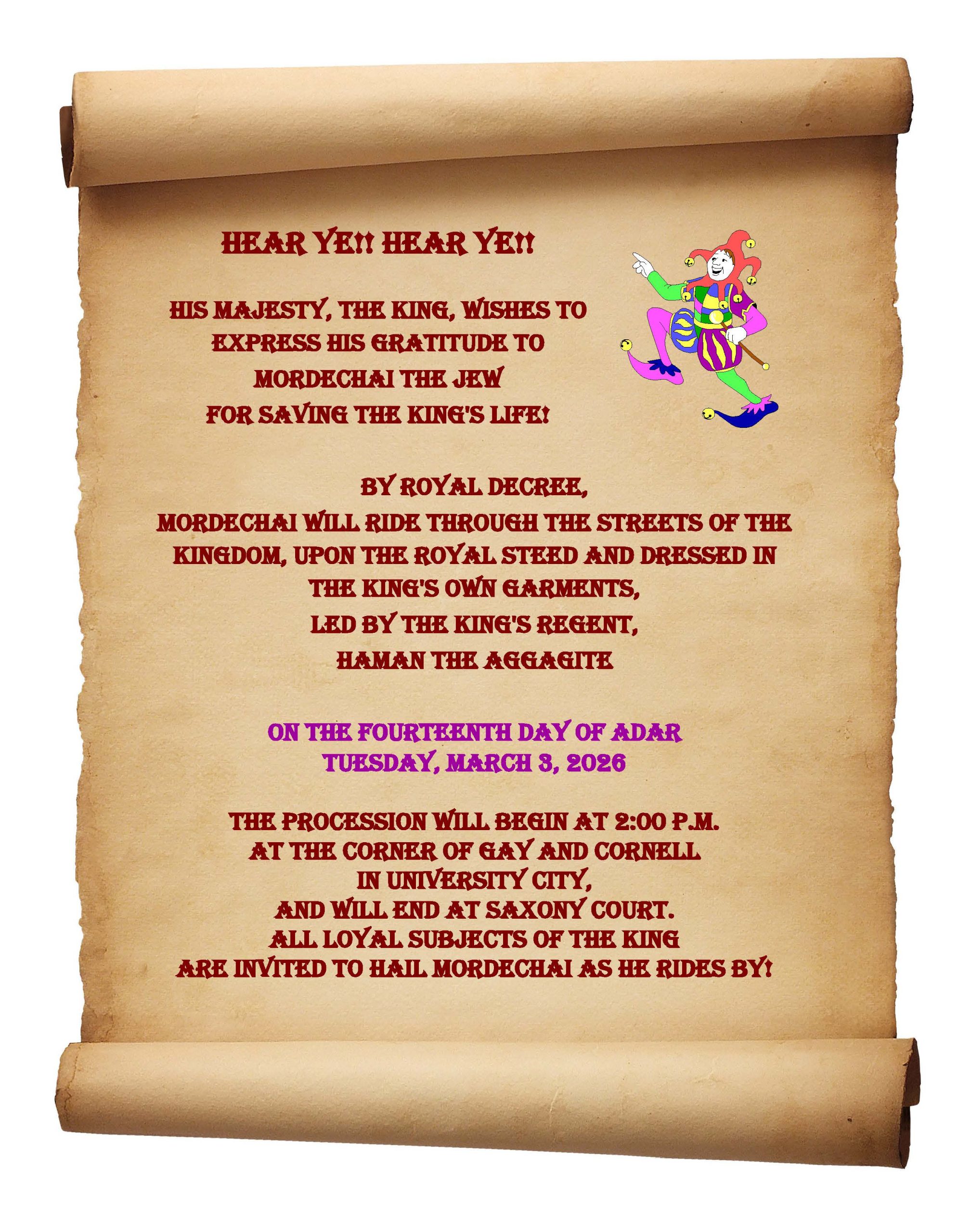 Are Invited to Hail Mordechai as He Rides By!